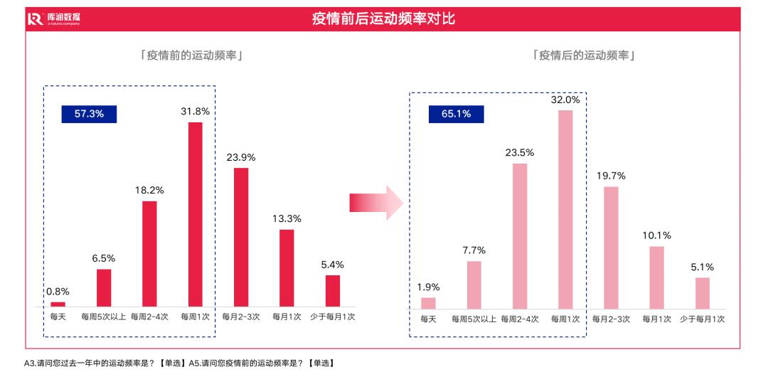 疫情后每周至少运动一次的人占比65.1%,较疫情前涨幅显著,近10%,可见疫情促使人们关注健康生活。