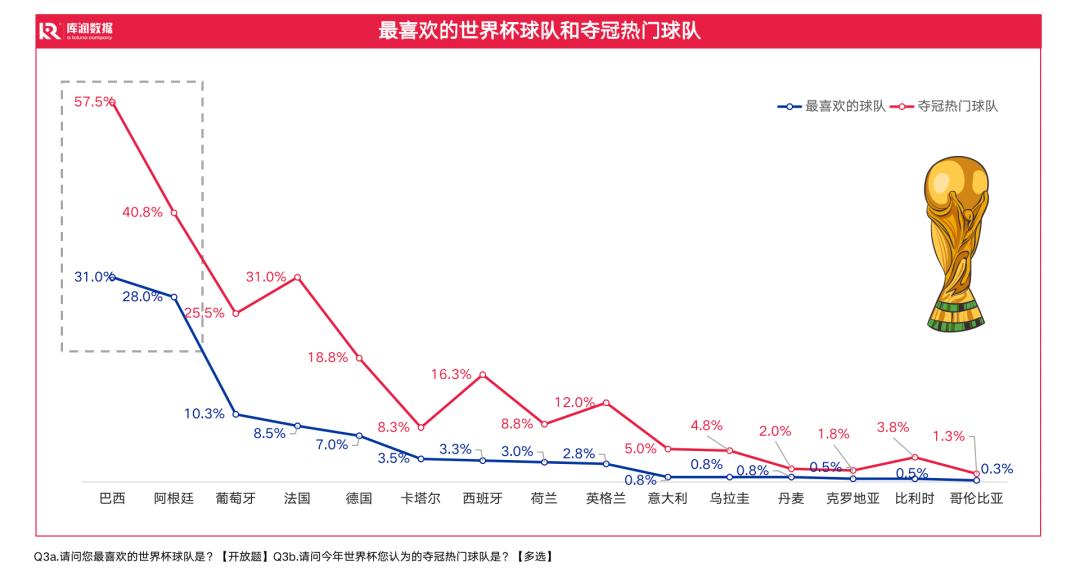 巴西和阿根廷受欢迎程度排列前二(巴西57.5%vs阿根廷40.8%),且夺冠热度同样名列前茅(巴西31.0%vs阿根廷28.0%);
