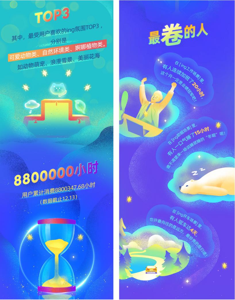 依靠对用户三大场景下多样化音乐陪伴需求的精准把握,ing场景音乐的产品体验得到了越来越多用户的认可与支持。以ing工作场景为例,契合工作环境和个人心境的氛围不仅可以提升工作效率,还可以培养专注习惯:据数据统计,有用户连续使用ing工作场景20小时,堪称“敬业典范”。而在ing助眠场景下,通过营造舒缓放松的氛围,有用户在酷我音乐的陪伴下一口气睡满了15小时。除此之外,通过提神醒脑的动感音乐,ing开车场景也在为用户保驾护航,其中最长的陪伴时间达到了4天,见证了无数人说走就走的旅行。