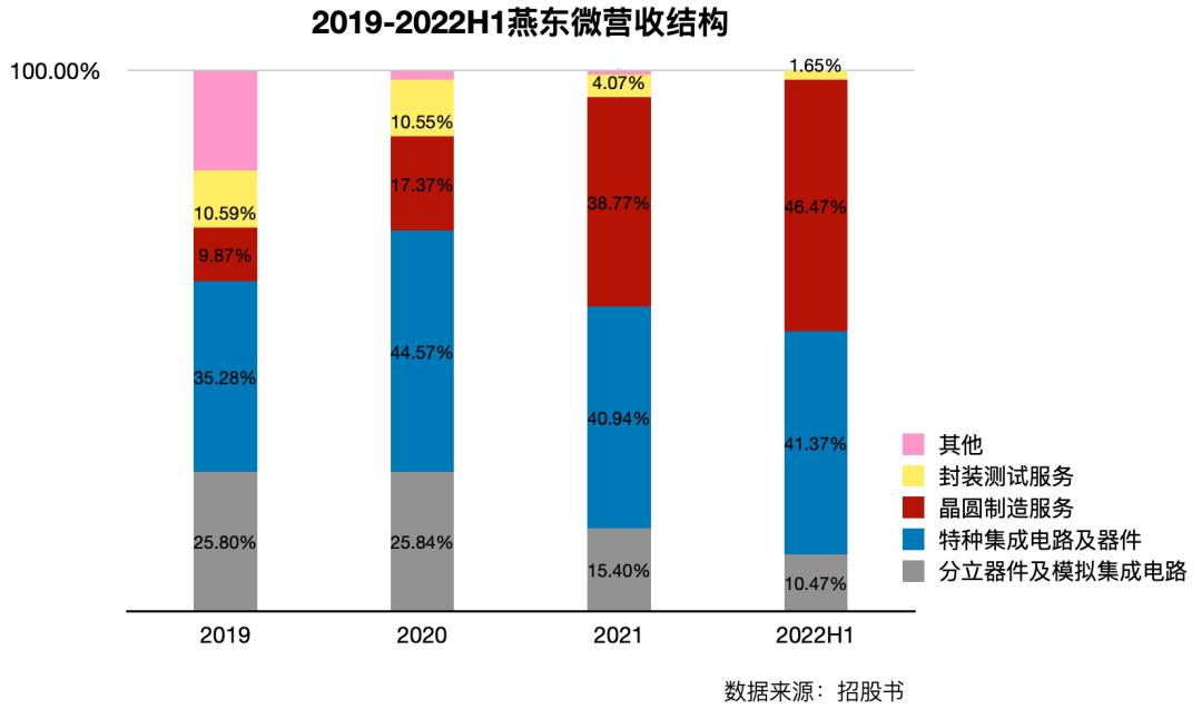 按照这个思路,燕东微联合开始逐步在市场中占据一席之地。至今,工艺成熟、市场需求量巨大的特种集成电路和分立器件市场,仍是燕东微的重要收入来源。