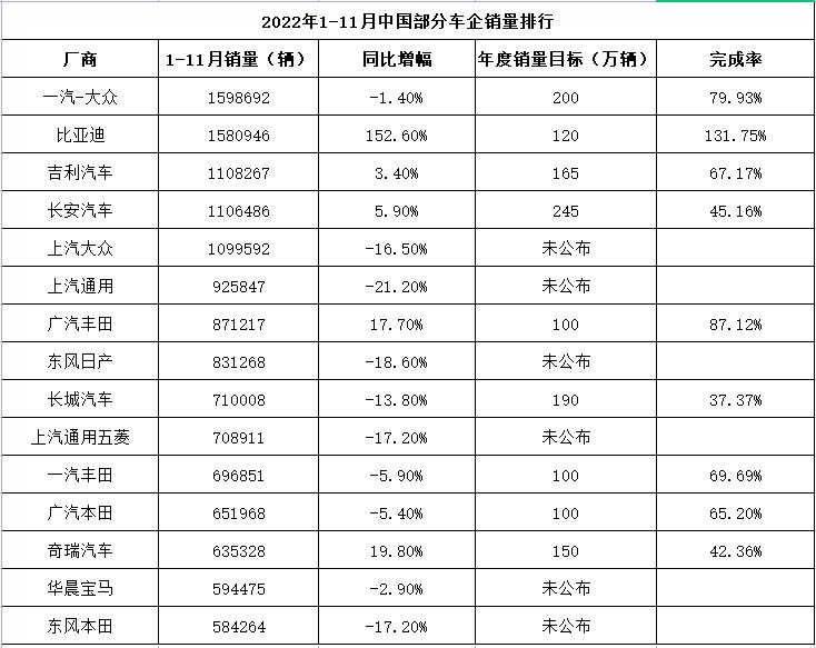 今年初,各大车企均提出了比较乐观的年度销量目标。截至11月,以新能源汽车销售为主的车企,目标完成率普遍较高;主营燃油车的车企们,完成全年销量七成的寥寥无几。