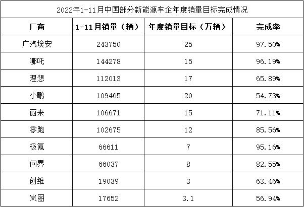 新能源板块,今年前11个月,广汽埃安、哪吒汽车、理想汽车、小鹏汽车、蔚来汽车、零跑汽车等六家累计销量突破了10万辆,其余的企业离“10万辆俱乐部”还较远。其中,广汽埃安、哪吒汽车和极氪汽车的销量完成率分别达到97.5%、96.19%和95.16%。