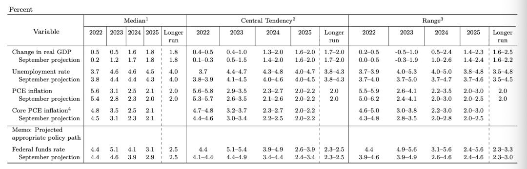 美联储小幅调整了今年和未来的失业率预期。美联储预计2022-2024年失业率将分别升至3.7%、4.6%、4.6%,分别较9月份调低0.1、调高0.2和提高0.2个百分点。
