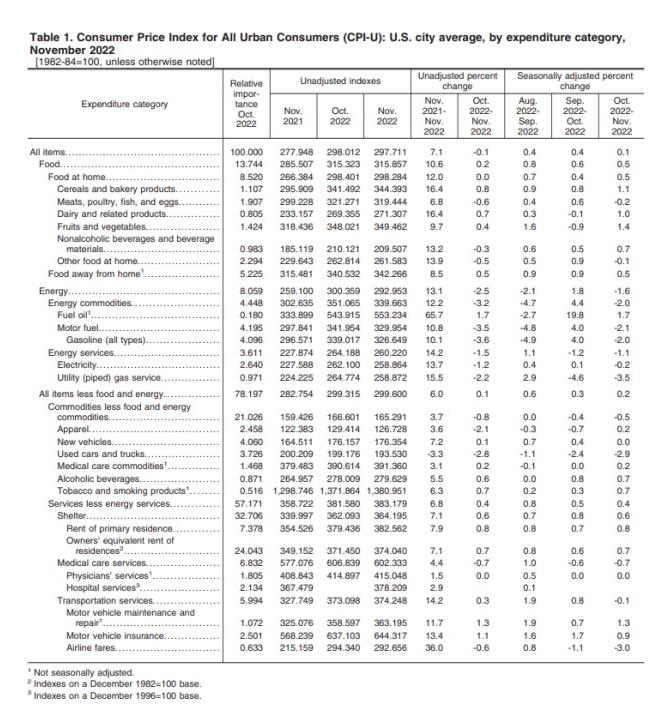 当地时间12月13日,美国劳工部公布数据:美国11月消费者价格指数(CPI)同比增长7.1%,低于预期7.3%,大幅低于前值7.7%;环比增长0.1%,低于预期0.3%,也低于前值0.4%。剔除能源和食品价格的核心CPI同比上涨6.0%,低于预期6.1%,也低于前值6.3%;环比上涨0.2%,低于预期0.3%,低于前值0.3%。