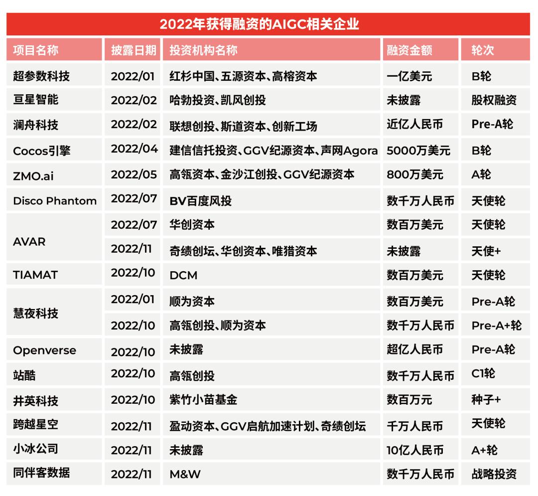 据极客公园的不完全统计,在 2022 年,在中国至少有 15 家拿到新融资的 AIGC 相关企业,红杉中国、高瓴资本、DCM 创投等一线机构均有出手。多家短视频平台的高层也开始研究 AIGC,探寻是否存在技术带来的新机会。