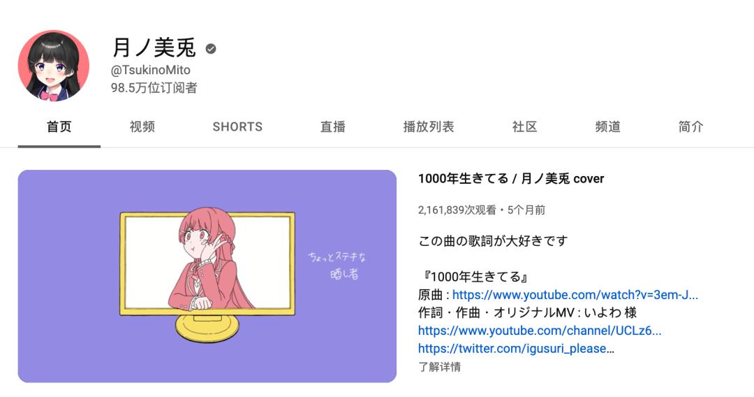 初代虚拟主播月之美兔,YouTube 粉丝 98 万|来自 YouTube 截图