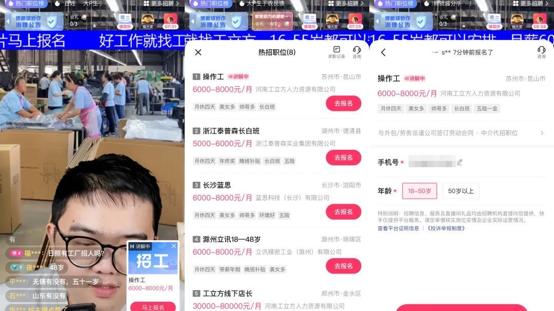 快聘界面,主播直播背景正轮流播放工厂环境视频,投递简历仅需电话及年龄。|极客公园制图