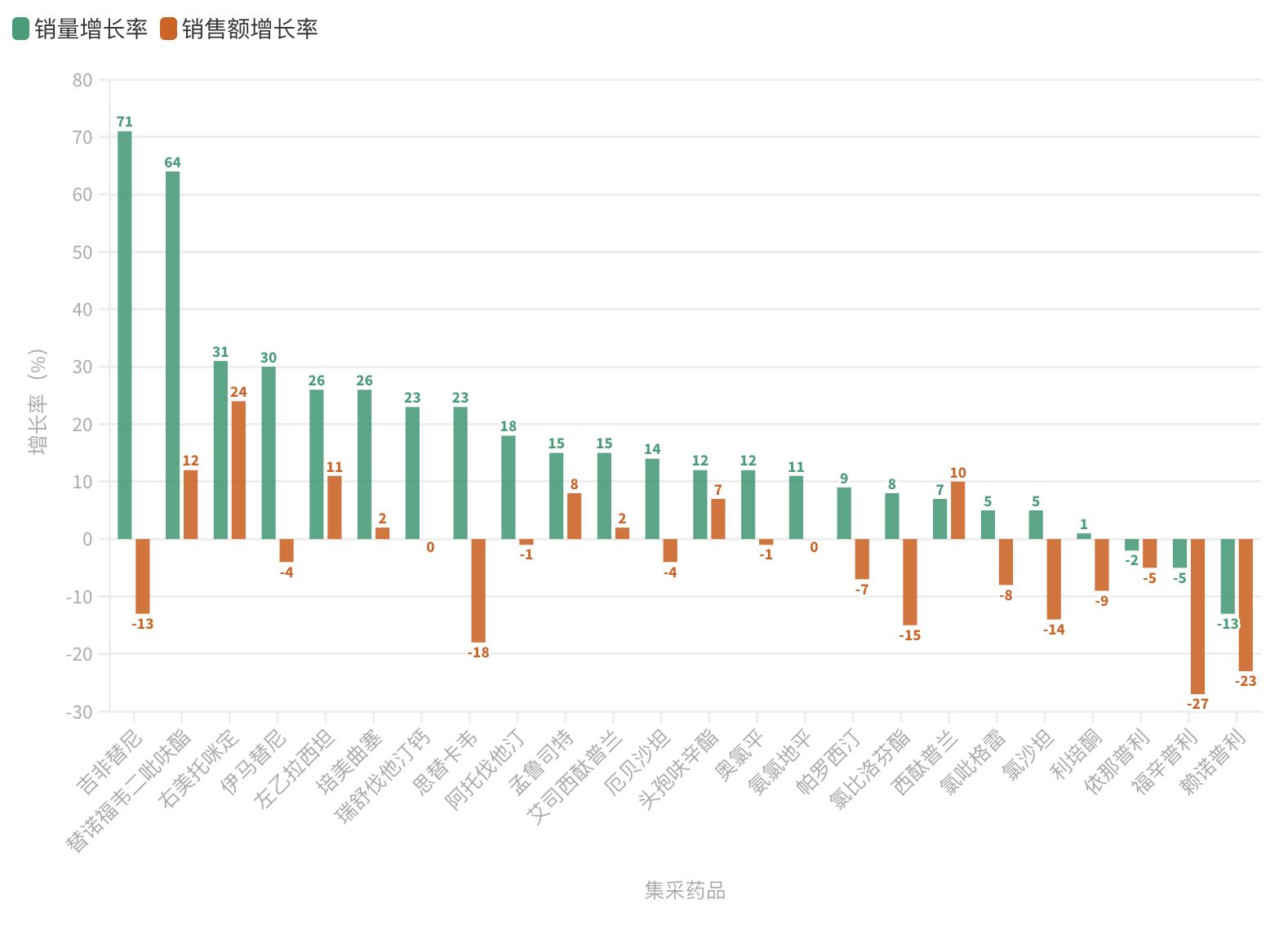 但“以价换量”策略的代价,甜了患者,苦了药企。以2018年由政府在4个直辖市、7个省会城市实施的“4+7”带量采购为例,被纳入集采范围的25种药物中,21种药物销售量增长显著,但仅有7种药物在2019年实现了销售额的正向增长。