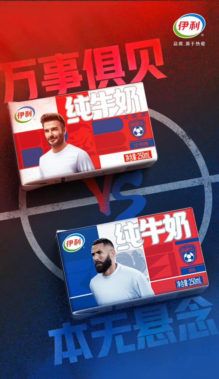 与线上动作一起「突围」的,还有实际产品的包装。贯穿TVC的伊利牛奶,也有了新的花样。伊利推出的「梦之队限量款」包装,正面是签约球队球星形象、背面则是最能引起球迷共鸣的球星文案——阿根廷球迷的「一日蓝白,一生蓝白」、C罗的「没有人会一直年轻,但不服输的心会」。