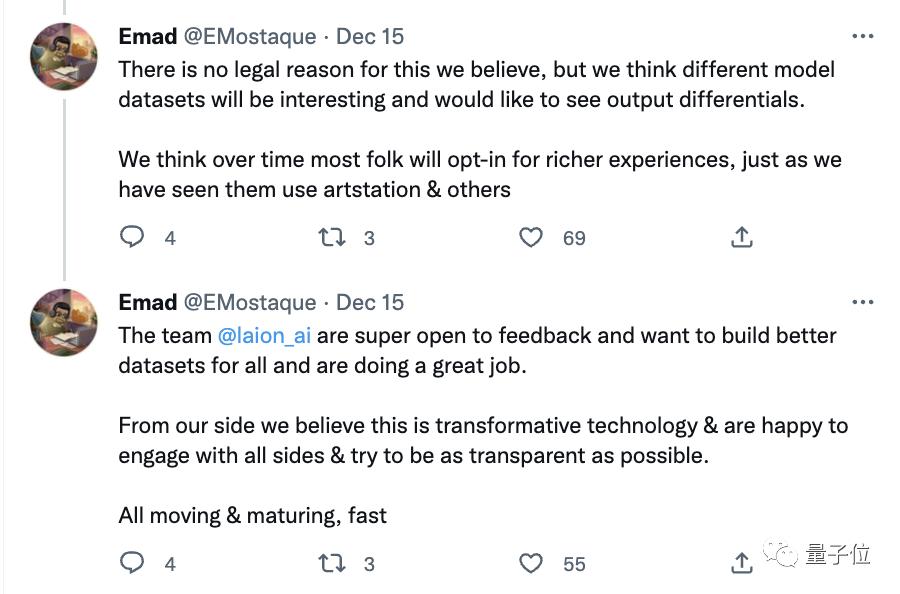 不过,就让艺术家自动选择加入或删除图像这事儿,CEO同志Emad Mostaque毫不忌讳地表达了自己的开放态度。