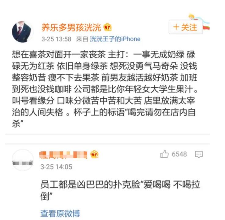 丧茶的爆红,其实最早源自3月25日,微博上一个叫@养乐多男孩洸洸 的网友在排队买喜茶时的吐槽……