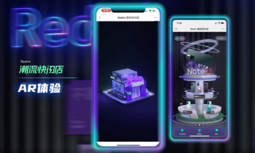 比如小米Redmi Note11双11首发上线,米粉可以在线上快闪店中融合AR,完成手机试拿、AR手表试戴和3D耳机展示等体验。