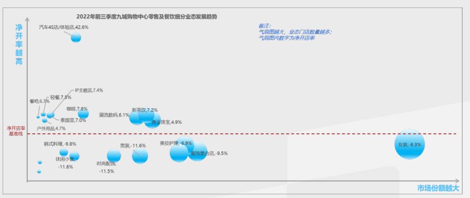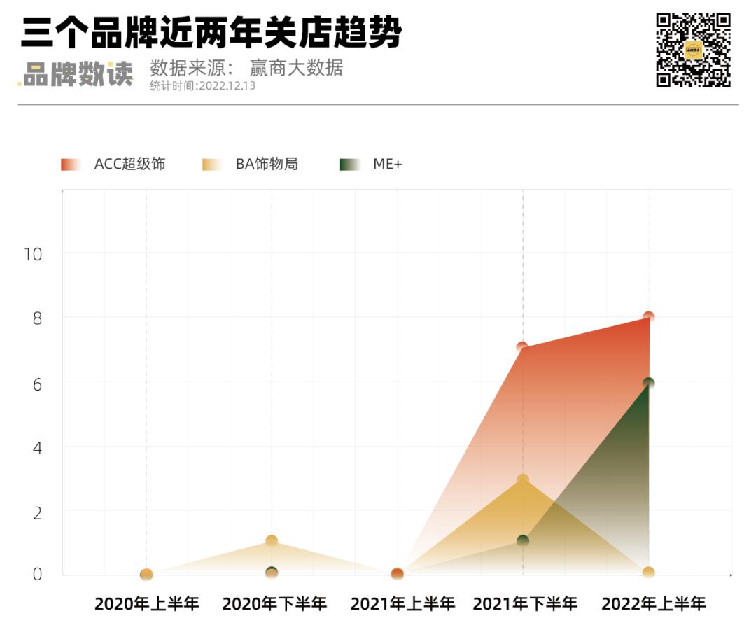 而赢商大数据证实了三家品牌开店卸劲:2021年下半年,ME+、ACC和BA三家品牌开店迎来了小高峰,在2022上半年关店成为主流。2021年,三个品牌新开了98家门店,关店9家,而2022年前三季度,三个品牌新关14家门店,新开仅4家,关店数是开店数的3倍不止。