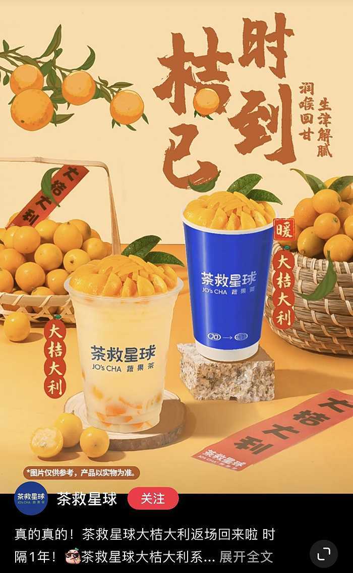 喜茶和茶救星球则围绕柑橘等做文章。前者加大了大橘大梨茶的推广力度,配上“真果搭配,维C护体”“喜茶你是懂润喉的”等广告语,茶救星球的大桔大利茶也选择及时返场,宣传时突出“润喉回甘,生津解腻”的关键词。