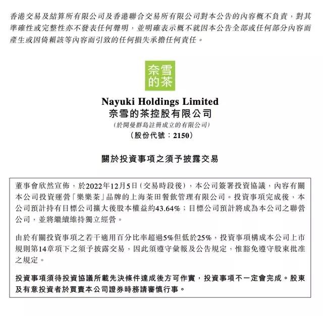 12月5日,奈雪的茶控股有限公司(下称“奈雪的茶”)发布公告称,已签署对乐乐茶主体公司上海茶田餐饮管理有限公司(下称“乐乐茶”)的投资协议。交易完成后,奈雪的茶将持有目标公司43.64%股本权益,即奈雪的茶将成为乐乐茶的第一大股东。