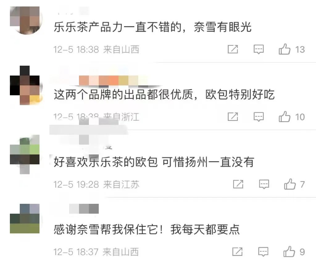 消息公布后,不少网友表示惊喜,“乐乐茶产品力一直不错的,奈雪有眼光”“这两个品牌出品都很优质,欧包特别好吃”,还有网友表示“感谢奈雪帮我保住它!我每天都要点”“乐乐茶守得云开见月明,两个会玩的品牌就是该玩在一起”。