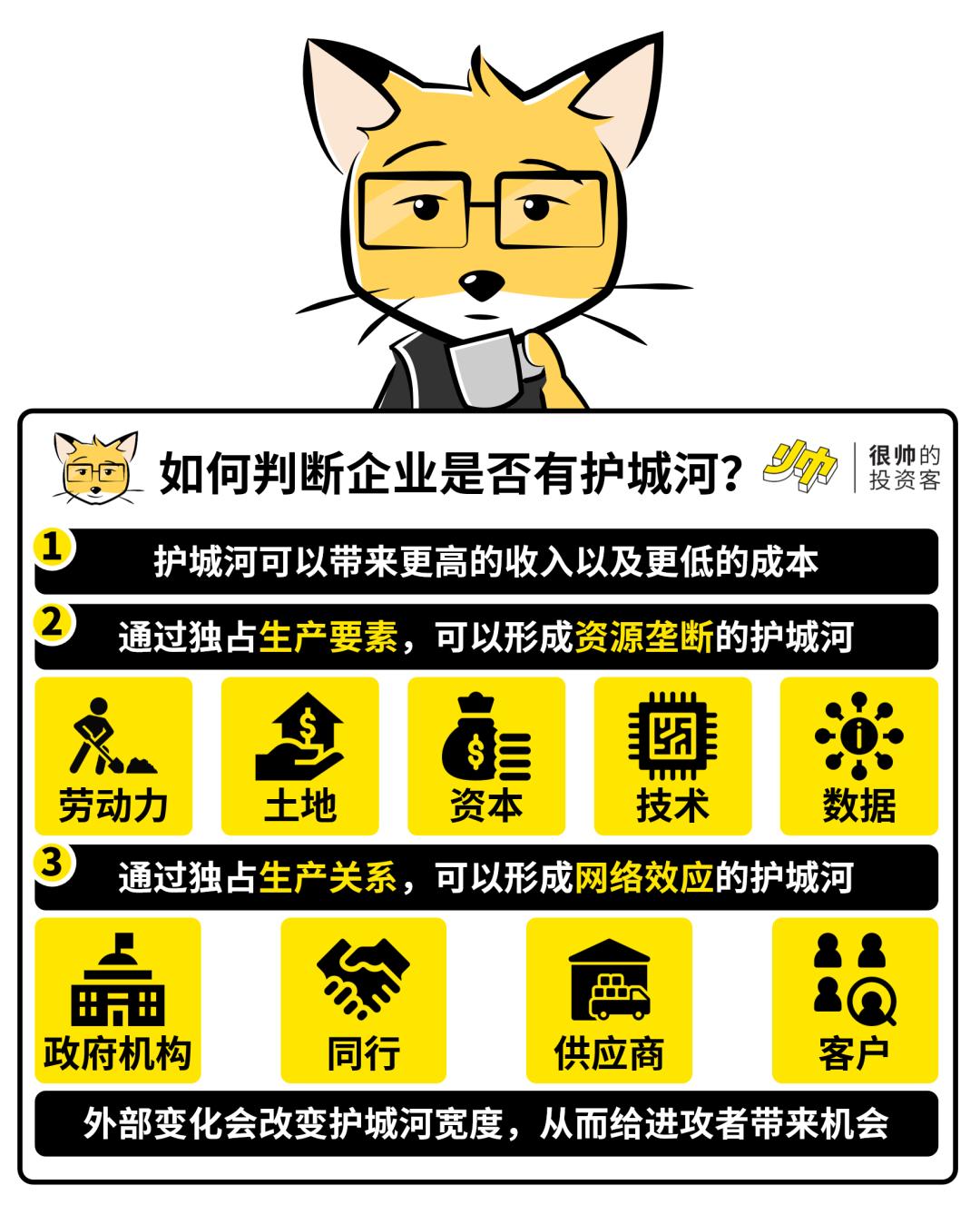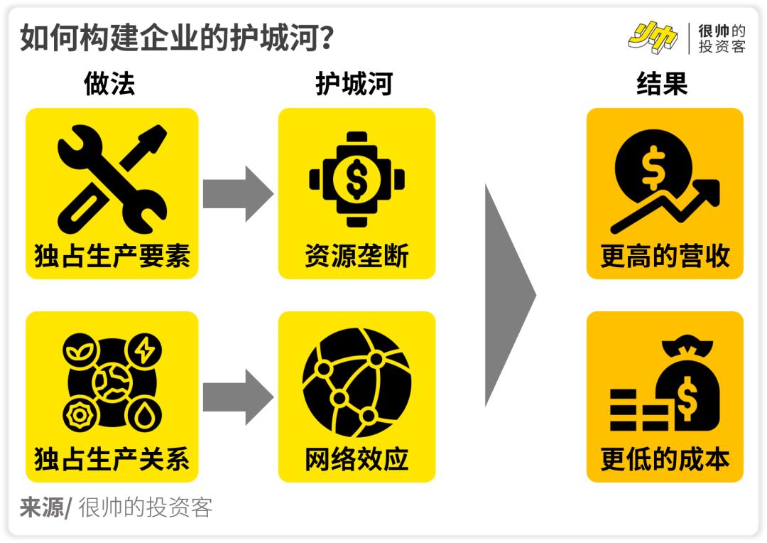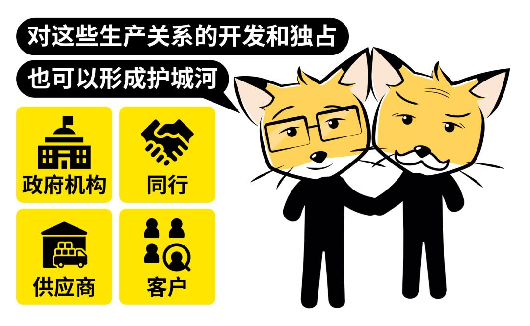 通过对生产要素的垄断(搞资源),可以形成资源垄断的护城河;通过对生产关系的垄断(搞关系),可以形成网络效应的护城河。