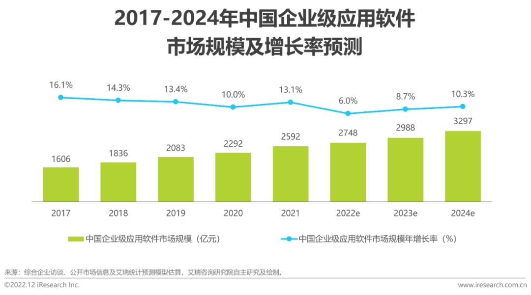 根据艾瑞咨询测算,2021年中国企业级SaaS市场规模达到728亿元,同比增速由2020年的48.7%下降到35.2%。 与疫情爆发之初受益于远程办公的利好形势不同,宏观经济下行、总需求收缩的影响开始逐渐传导到SaaS行业。预计2022年,SaaS行业的增速将首次下探至10%以下。未来三年SaaS行业的增长也将与宏观经济恢复速度相挂钩,在中性预期下,到2024年中国企业级SaaS市场规模将有望达到1201亿元,2021-2024年的年复合增长率为18.1%。