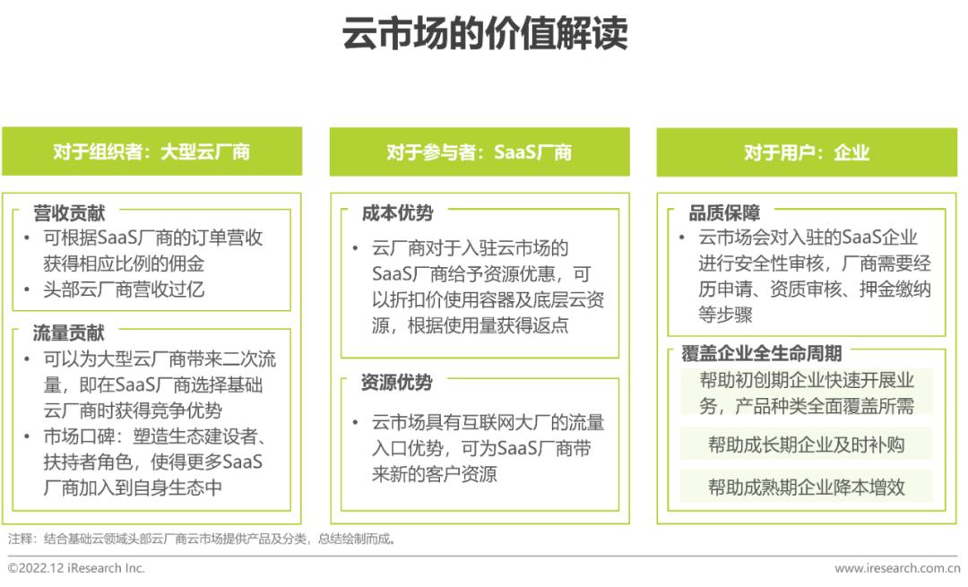 云市场能够帮助SaaS厂商触达更多用户,塑造企业品牌,借助大型云厂商的资源更好地与客户建立联系、增强信心;对于企业用户而言,经过筛选与分级的SaaS厂商也更有质量保障。云市场往往会对ISV进行分级,并负责引流推广,目前营销、HR、零售电商、建栈类SaaS在几大云市场中关注度较高。除了综合性云市场,垂直办公场景中同样出现了类似的玩法(如“云钉一体”)。