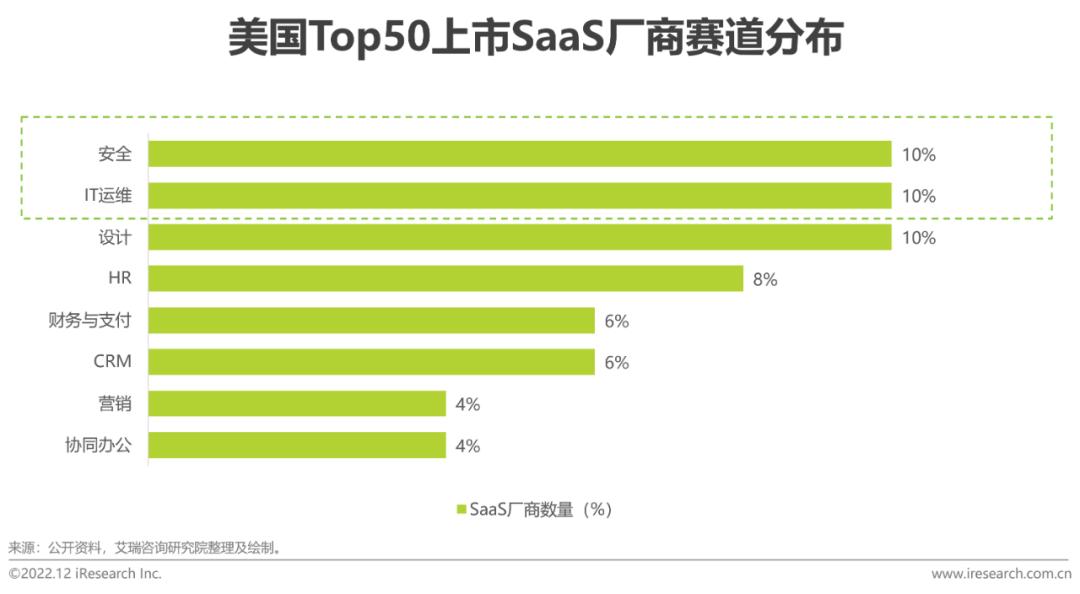 2022年是全球SaaS市场发展放缓的一年,相比于2021年热门赛道厂商动辄数十倍的估值,厂商估值如今普遍已下降至5-10x P/S,甚至低于2020年疫情前的水平。这与整体经济式微有关,也是前一年热度激增后的理性回归,但长期看软件仍是经济发展最重要的动力之一,基于云的商业模式会持续为产业带来长期增长。美国一直被认为是全球SaaS市场的风向标,占全球软件市场36%,但占据全球SaaS市场60%的市场份额,整体来看,国内SaaS市场总量依然不及欧美发达市场,且从品类分布上看,安全运维、开发类产品发展偏弱。