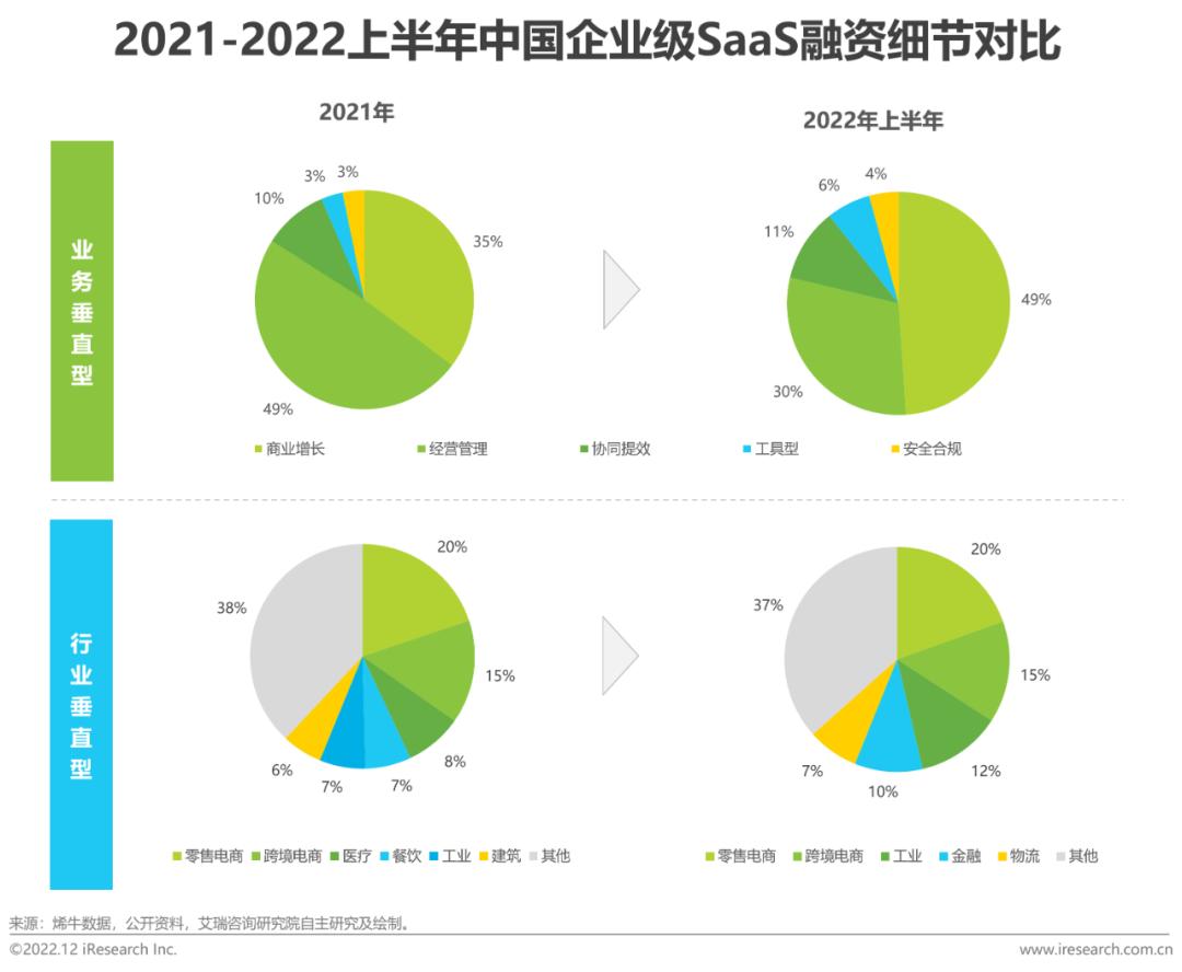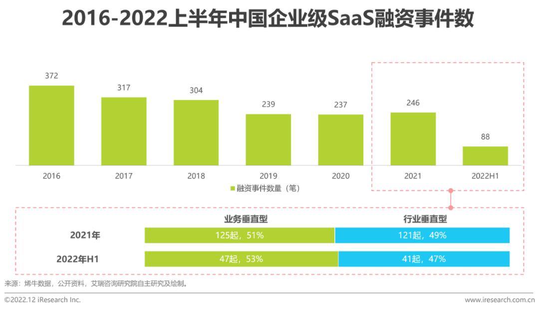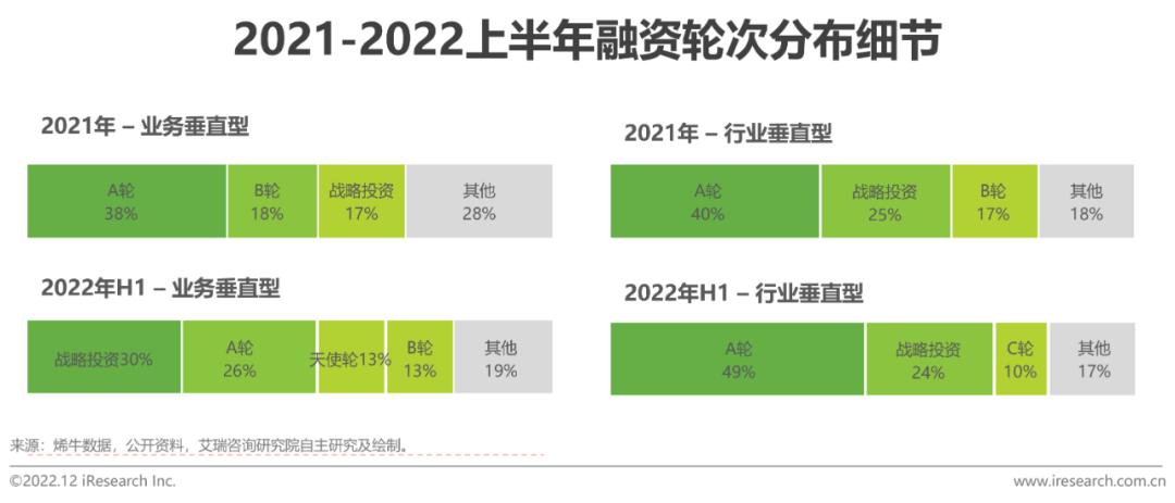 相比2016年,2022年上半年的股权投资、收并购等战略投资比重增加了21.4个百分点,而天使轮与种子轮占比下降了18.6个百分点,可见中国企业级SaaS市场走向成熟的同时,资本市场对“概念热度”的态度更加理性,目光分别向产品初具形态的厂商及商业路径相对成熟的厂商侧倾斜。就2021年和2022年上半年融资结构上看,商业模式成熟的业务垂直型SaaS更受关注,而产品成型、潜力较大的行业垂直型SaaS更受青睐,但整体没有呈现太大差异。