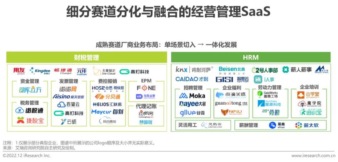 财税与HRM赛道逐渐成熟,厂商由点及面加速一体化布局;工具型 SaaS横向渗透并融合特定业务场景来发挥自身价值