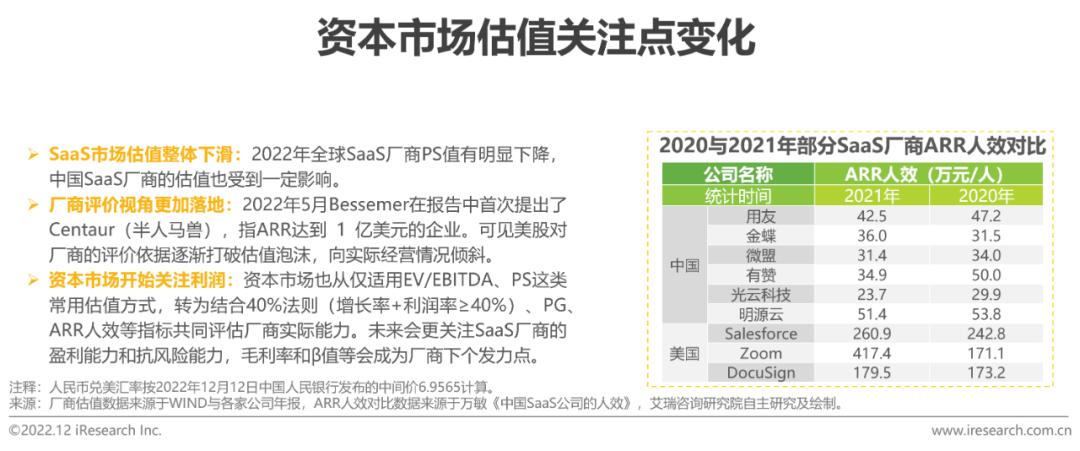 美国是全球SaaS发展最成熟的市场,上市厂商数量、SaaS化程度与覆盖场景数量都处于绝对领先地位。但在过去一年,其SaaS市场却出现了负增长,BVP新兴云指数为-50.9%,缩水程度远高于大盘。对比来看, SaaS公司的估值倍数已经降到了低于大部分历史水平的程度:比5年平均水平的12.9倍低32%,相比10年平均水平的9.4倍也低了7%。这意味着一些SaaS厂商过去“低利率、快扩张”的打法目前受到强烈挑战,而国内的SaaS厂商亦同样受到波及。