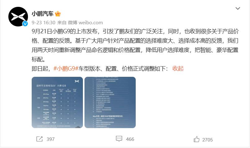 2022年9月21日,担负着小鹏“走向高端市场”和“改善毛利率”双重任务的G9宣布上市,但随即翻车。其低配高价的产品营销策略、复杂难懂的产品配置引发消费者不满。上市仅仅两天,G9 被紧急下架。尽管小鹏官方“光速补救”,通过增配减价、调整命名、“二次上市”来挽救口碑,但还是遭到了消费者的大量退订。