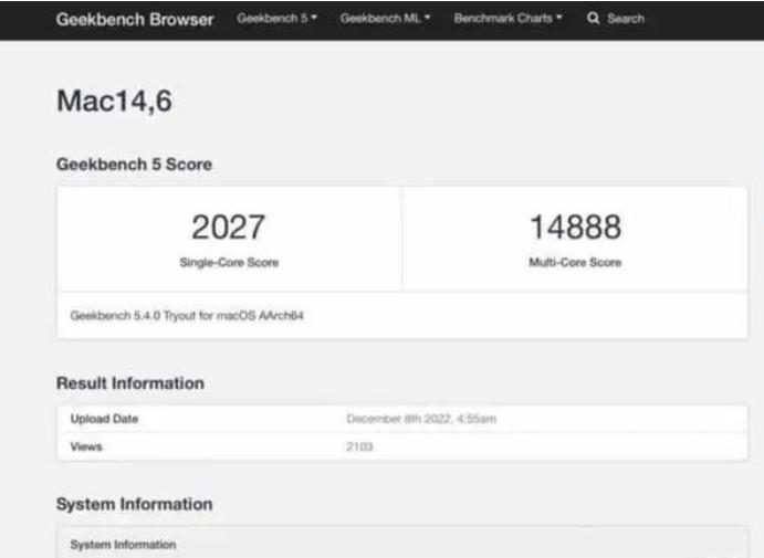前不久,Geekbench 跑分平台上周曝光了M2 Max 芯片跑分,单核处理器成绩为 1889 分,多核成绩为 14586 分。而该平台再次曝光了 M2 Max 芯片的最新跑分成绩,单核处理器成绩为 2027 分,多核成绩为 14888 分,单核成绩提升明显,不出意外,又是一台“性能怪兽”。