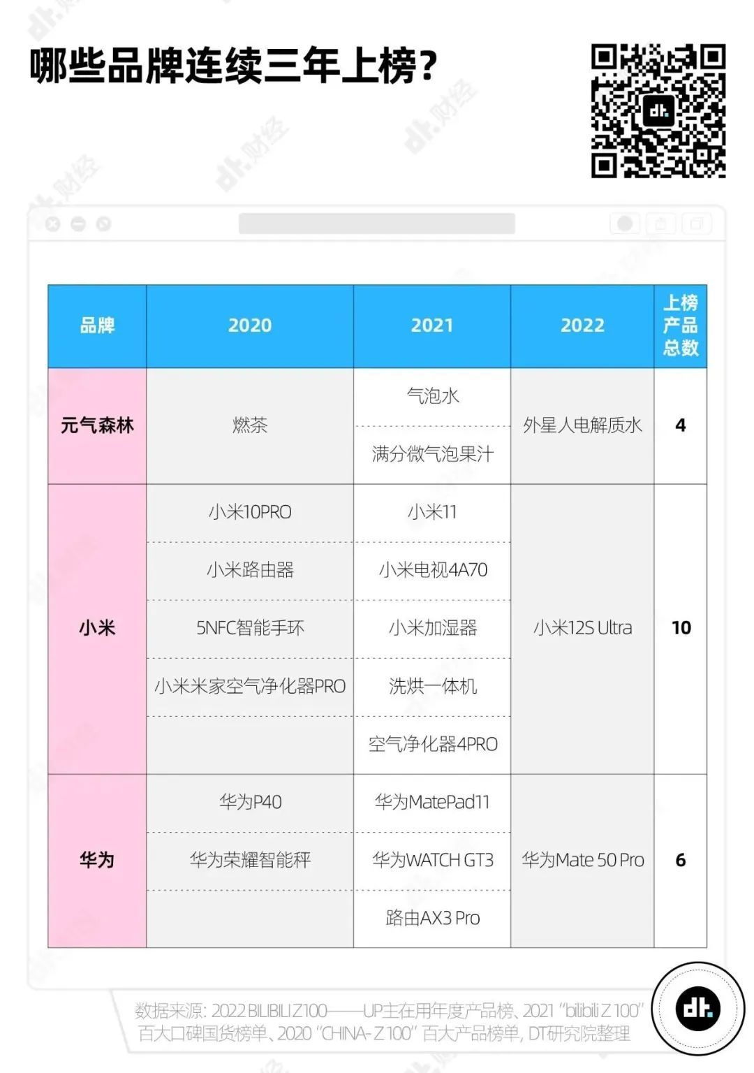 对比前两年的榜单,我们发现总共有3个品牌连续3年上榜,分别是:元气森林、小米和华为。关注新潮事物、关注硬核科技是这些年来B站年轻人始终没变的地方。