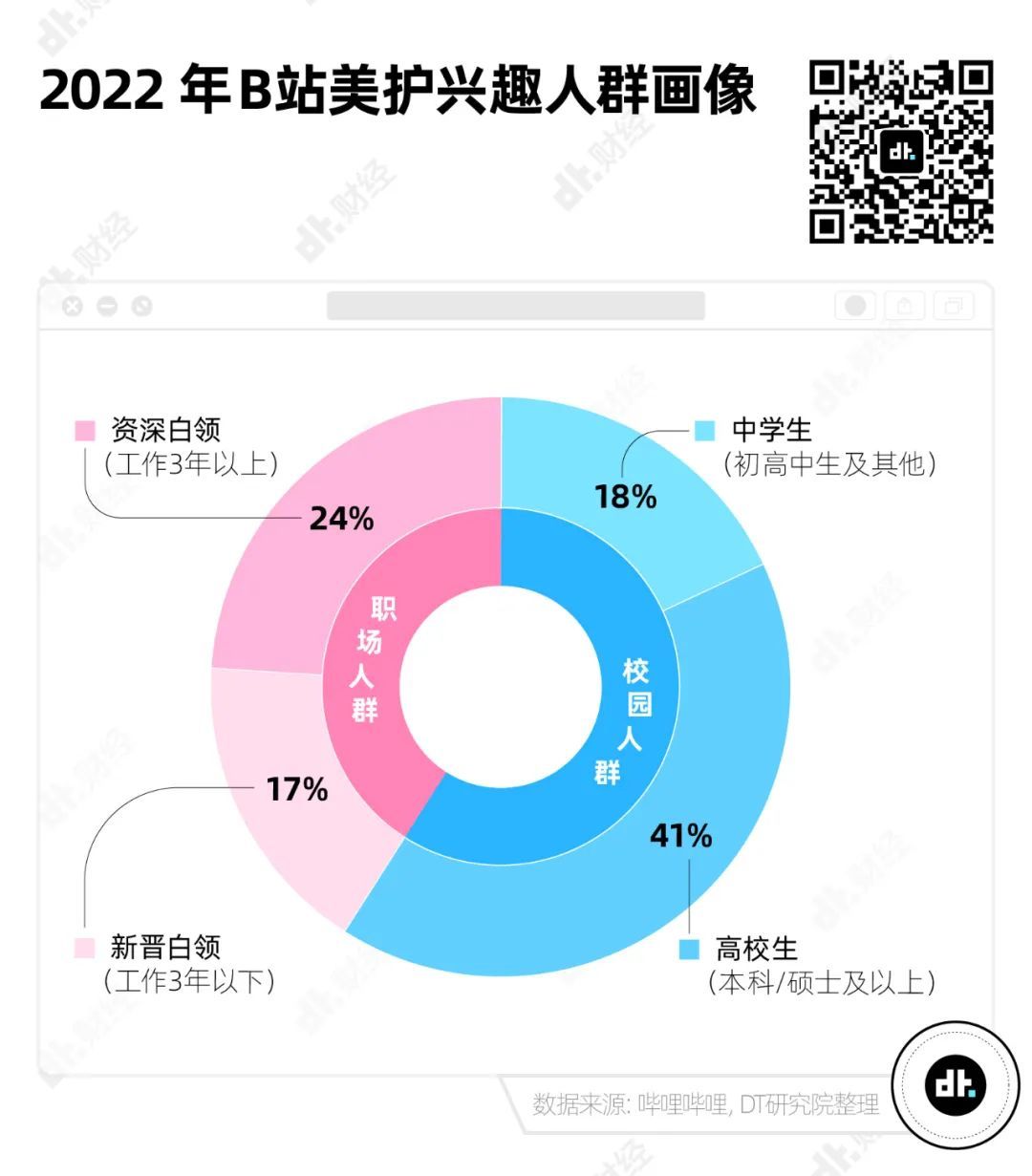 根据《2022哔哩哔哩美妆个护行业营销解决方案》,在B站美护爱好者中,精致白领人群占比41%,其中“工作三年以上”的资深白领占比24%。