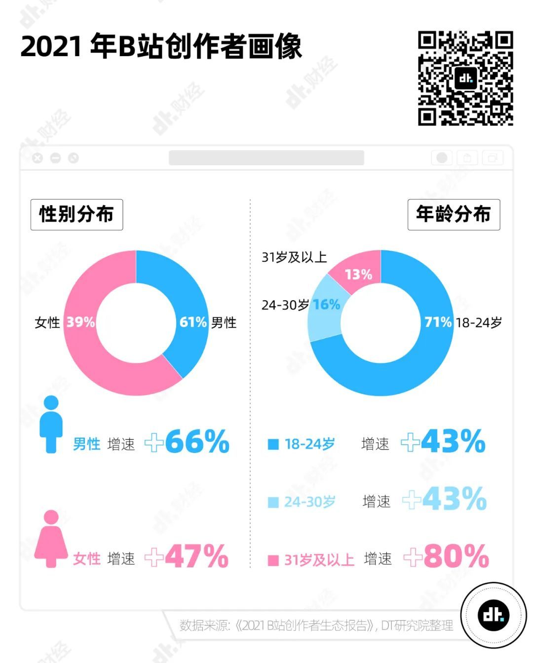 《2021 B站创作者生态报告》显示,B站的创作者画像中,就包含了14%的31岁+创作者,并且在过去的一年中,31岁+创作者数量增速高达80%,远高于年轻创作者的数量增速。