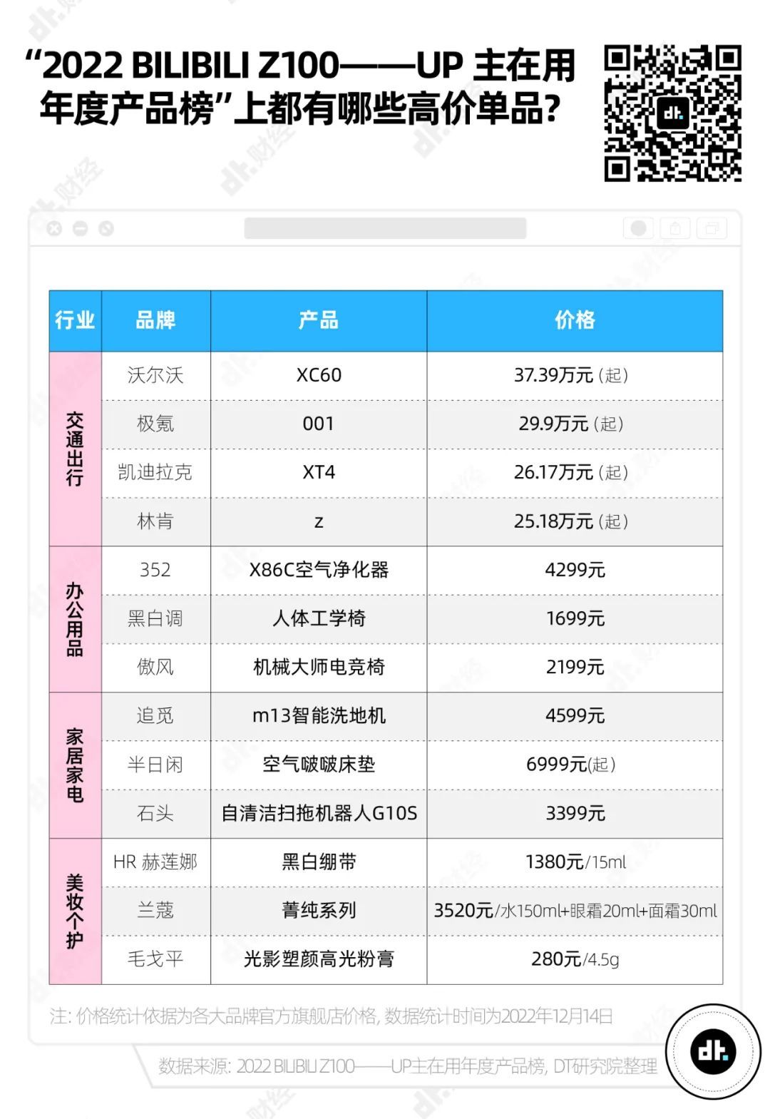 这份榜单的评选维度包含“UP主推荐”“播放量”和“点赞量”3个维度,可以说是一份由UP主和B站用户共同选出来、能代表B站群体偏好的产品榜单。榜单包含美妆个护、交通出行、食品饮料、家居家电、数码3C、办公用品、鞋服箱包饰品、宠物用品、运动健康、休闲娱乐共10个行业的品类。