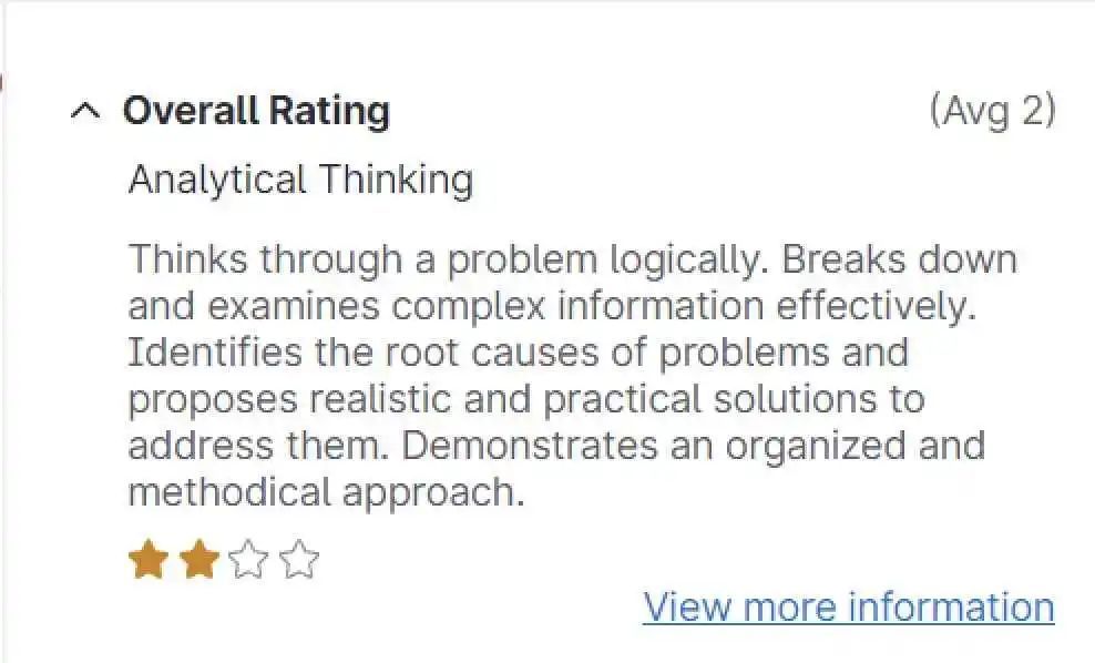 但面试官当然不是来听故事的,这每一道问题后面都暗藏玄机。在面试官的界面中,每道题旁边都会显示出 HR 设计这一题的目的(即主要的考察点,如商业感知、团队精神、沟通能力等)。而作为面试官,我们就会根据这些要素在「故事」中寻找要素(indicators),并且进行打分。