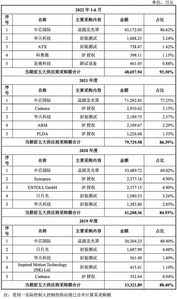 灿芯股份主要采购晶圆及光罩、IP、封装测试等,报告期内向前五大供应商合计采购金额占当期采购总额的比例分别为88.40%、84.93%、86.39%与93.30%,供应商集中度较高。