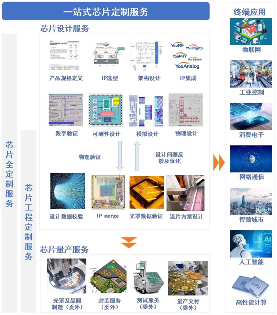 芯片工程定制服务主要是根据客户需求,完成工艺制程及半导体IP选型、设计数据校验、IP Merge、光罩数据验证、流片方案设计及工艺裕量优化、系统性能评估及优化、封装及测试硬件设计、测试程序开发等设计服务,并根据客户需求整合晶圆代工厂与封测厂等第三方厂商资源向客户提供晶圆制造、芯片封测等量产服务。