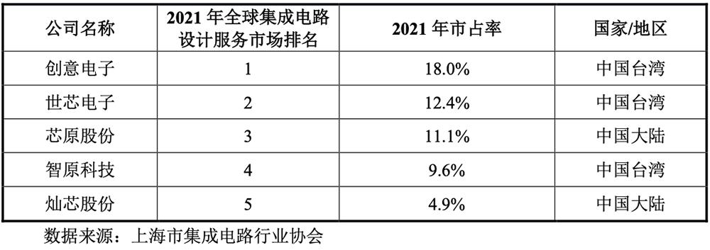 上海市集成电路行业协会报告显示,2021年全球、中国大陆的集成电路(IC)设计服务市场规模分别约为193亿元、61亿元,自2016年以来的年均复合增长率分别约为10.6%、26.8%。灿芯股份占2021年全球集成电路设计服务市场份额的4.9%,位居全球第五。