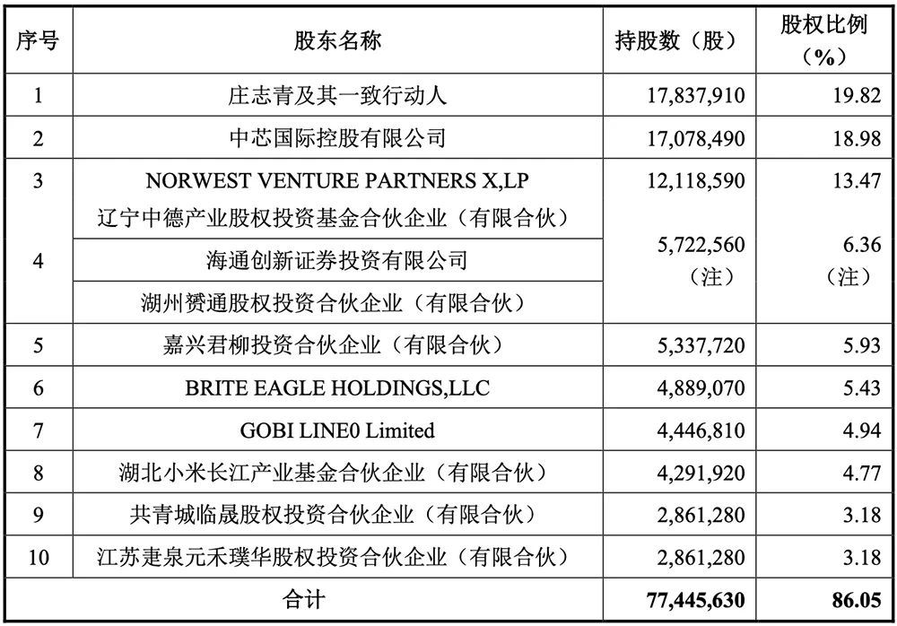 本次发行前,中芯国际控股有限公司为其第二大股东,持股18.98%;湖北小米长江产业基金合伙企业为其第八大股东,持股4.77%。