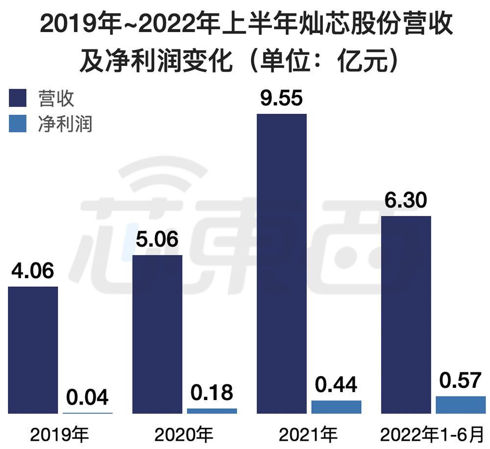 2019年、2020年、2021年、2022年上半年,灿芯股份营收分别为4.06亿元、5.06亿元、9.55亿元和6.30亿元;净利润分别为0.04亿元、0.18亿元、0.44亿元、0.57亿元。