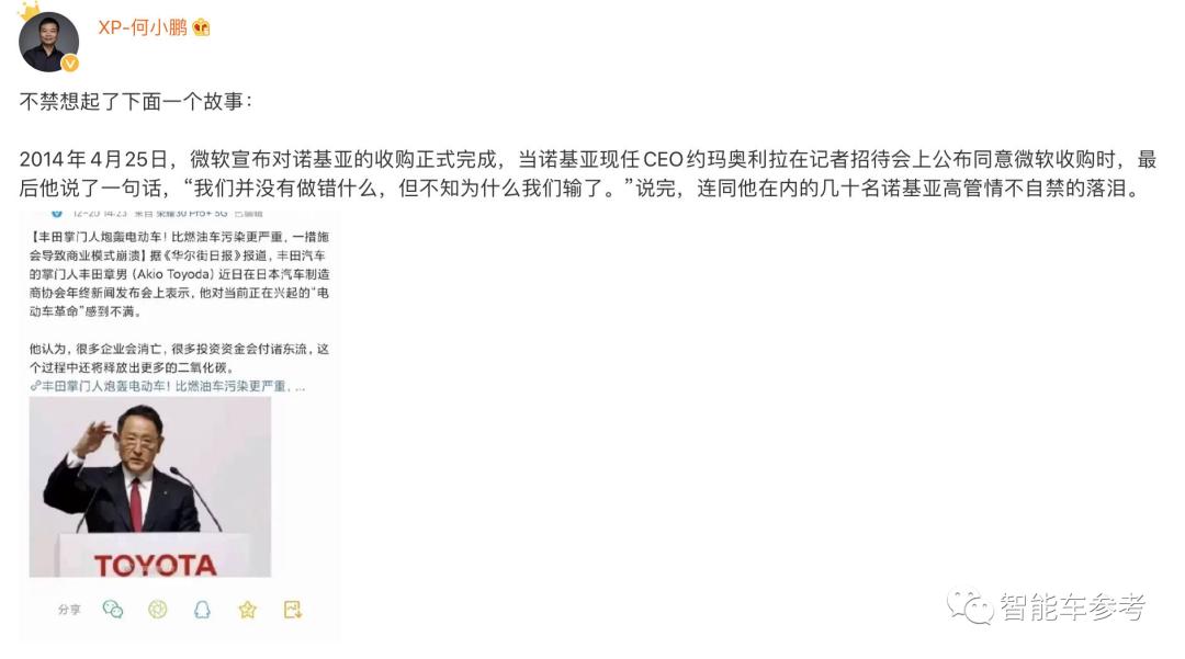 当时,何小鹏甚至因此发了一条微博吐槽,字里行间似乎以“诺基亚”影射丰田: