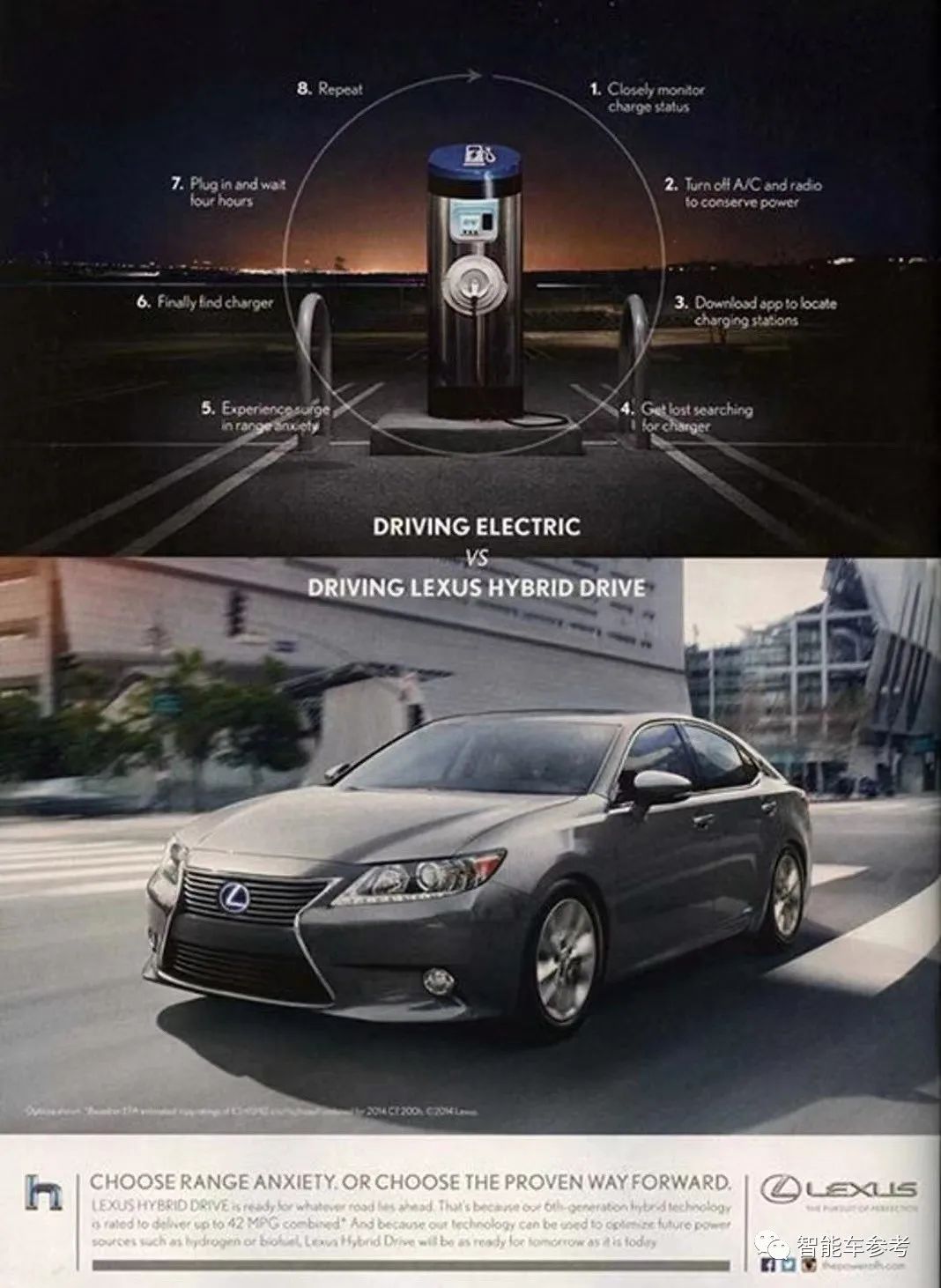 丰田旗下雷克萨斯品牌,在早些年的广告中,甚至把自家的混动汽车和纯电动车进行对比: