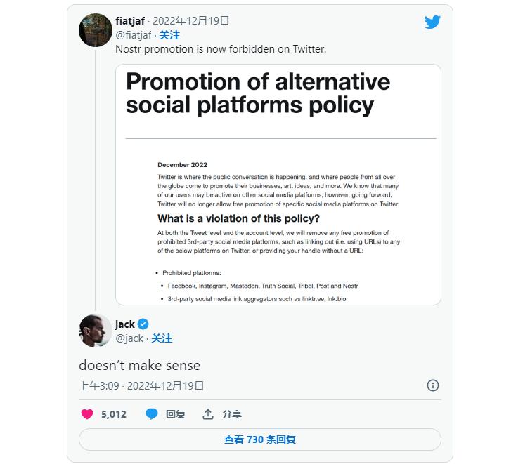12月18日,周日,推特在一条现已删除的推文中禁止宣传Facebook等竞争对手社交媒体平台的账户,这一举动甚至引起了马斯克的长期支持者,包括推特创始人杰克·多尔西(Jack Dorsey)的质疑,撑其“没意义”。