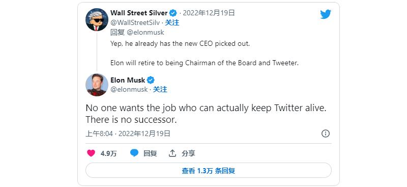 马斯克周日称,他将遵守民意调查结果,但没有详细说明如果结果表明他应该辞职,他将在何时辞职。他在回复一位推特用户关于CEO可能变动的评论时表示:“目前没有继任者,没有一个能让推特保持活力的人想接任这一工作。”