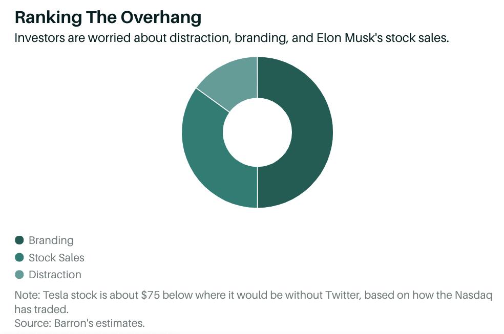 在马斯克控制了推特之后,特斯拉股价相当于每股跌了75美元。每股75美元的下跌基本上可以由这三部分组成: 马斯克卖出股票、管理层因马斯克经营另一家公司而分心,以及马斯克的推文对特斯拉的品牌损害。