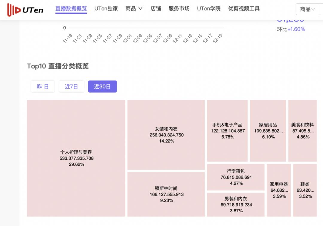 如今再看UTen数据,穆斯林时尚和女装、内衣品类在直播大盘的占比已经超过23%。面对占比达到29%的个体护理和美容品类,也是UTen会探索的重点。