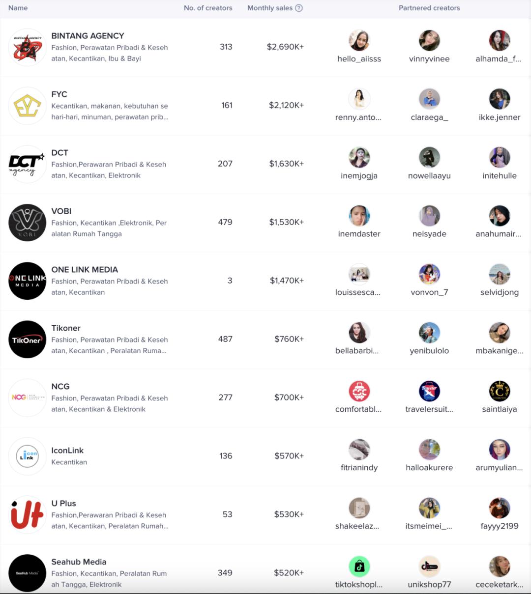 TikTok shop 官方数据显示,截至11月份,按电商GMV排序,TT印尼市场Top10的MCN机构榜单如下图所示,第一名 BINGTANG、第六名 Tikoner、第八名 onelink、第九名U Plus、第十名 Seahub Media,都是有中国背景的MCN,他们多数都是早期在印尼扎根的中国创业者,比如之前做shopee电商、手机游戏和电竞战队的。