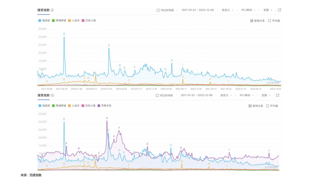 在疫情之前,查看百度指数可以清晰看到海底捞的声量有多大,这是对比海底捞、呷浦呷浦、小龙坎、巴奴火锅的百度指数数据,如果只看上面那张图,会发现蓝色线条(海底捞)的搜索量要比其他三家火锅品牌大非常多,而最高的两个时间点是2017年8月与2018年10月,分别是海底捞食品安全事件与上市时间点,即便如此,海底捞在平日的声量也一直保持在5000左右,第二大搜索量的小龙坎基本维持在1000左右;