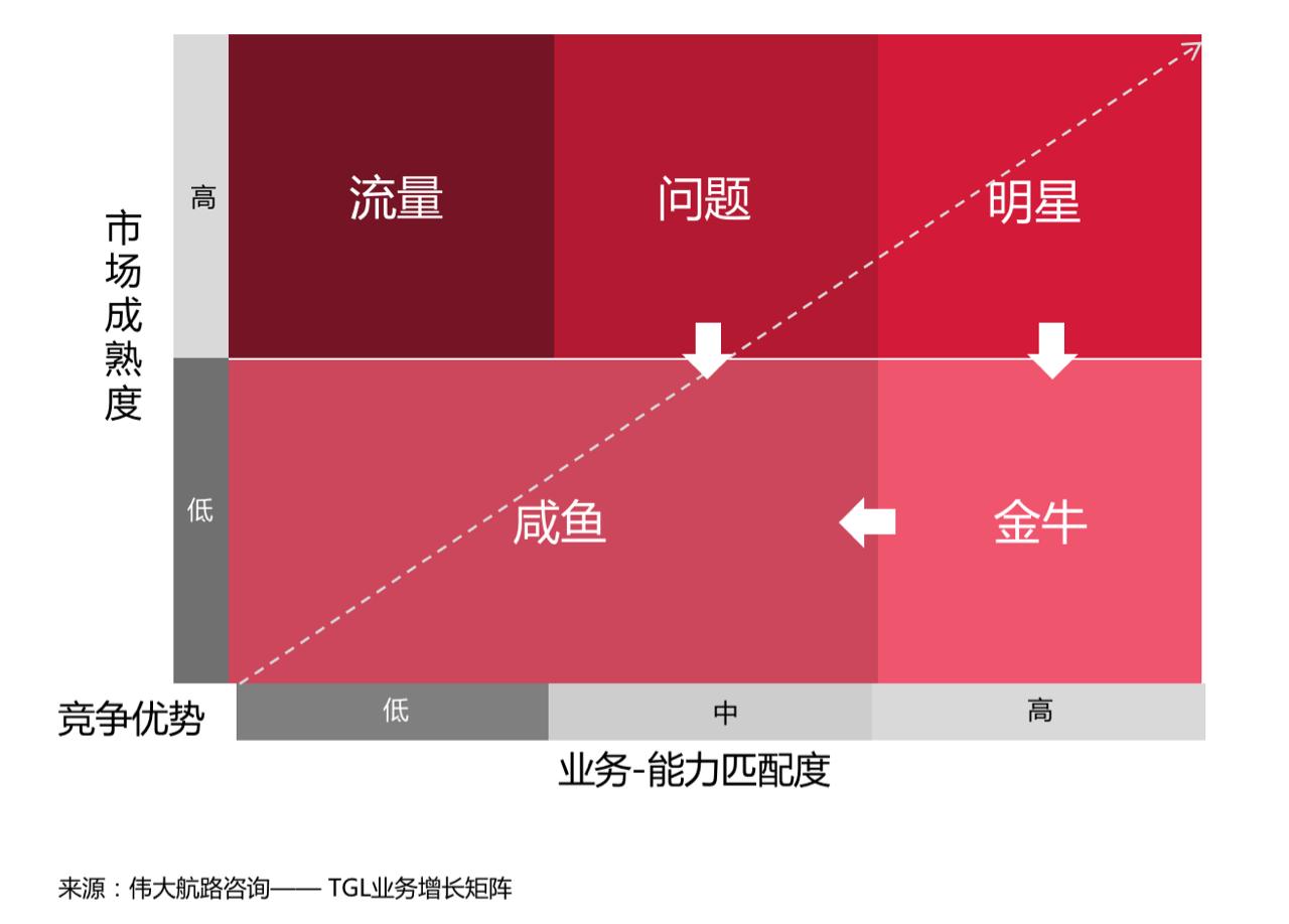 流量是指市场成熟度高,但能力匹配度较低的业务;问题是指市场成熟度高,但能力已经不够匹配的业务,比如汽车行业中的燃油车,电动车已经是大趋势,并且成熟度已经越来越高,传统车企如果去研发电动车则有可能会成为问题业务,因为其能力匹配度并没有完全吻合。