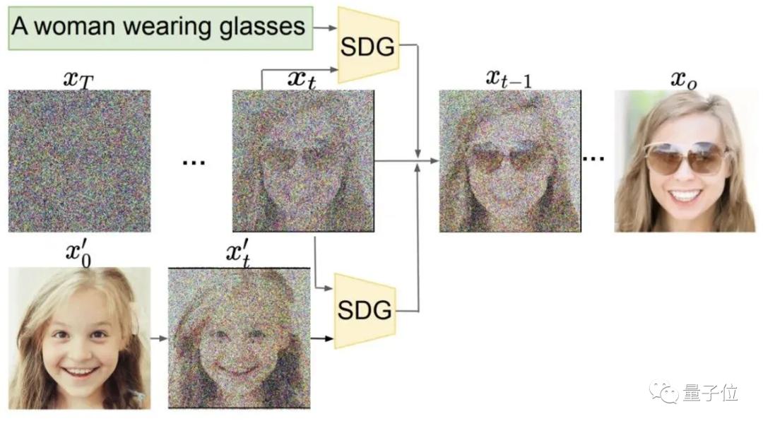 之后在去噪过程中,会不断拉近生成结果图和“a woman wearing glasses”的距离,从而使得生成结果逐渐变成了戴眼镜的成年女性。
