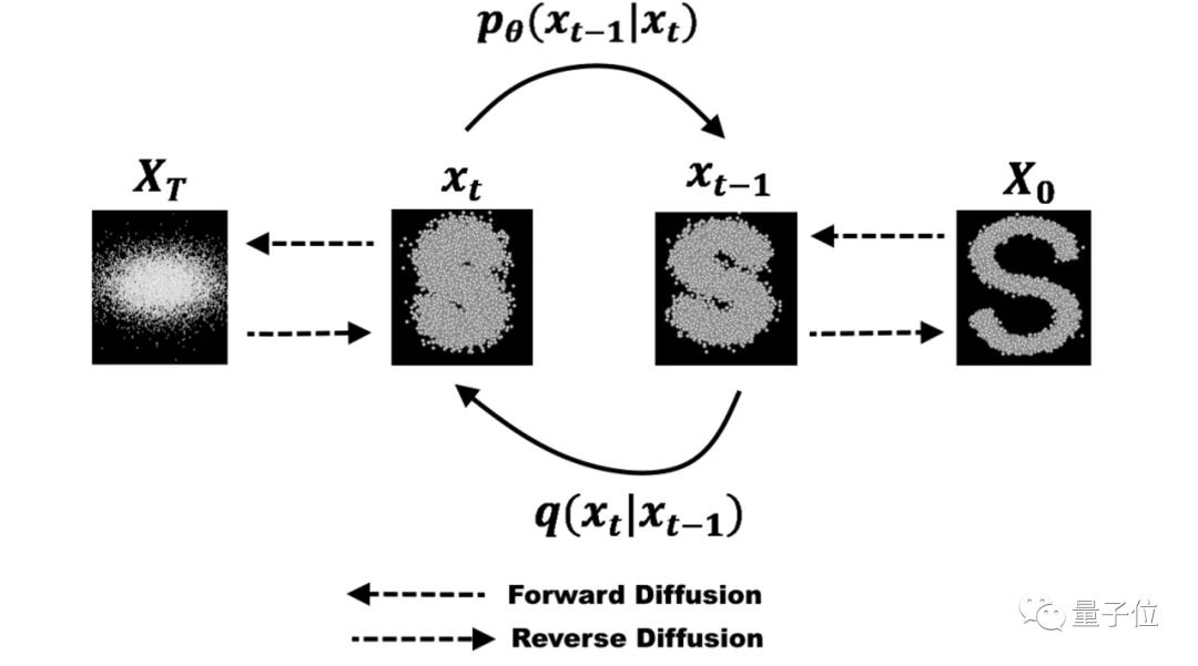 从右到左的Forward Diffusion是一个逐步地将正态分布的噪声叠加到图片上的过程,最终得到一张看起来完全是噪声的图片。